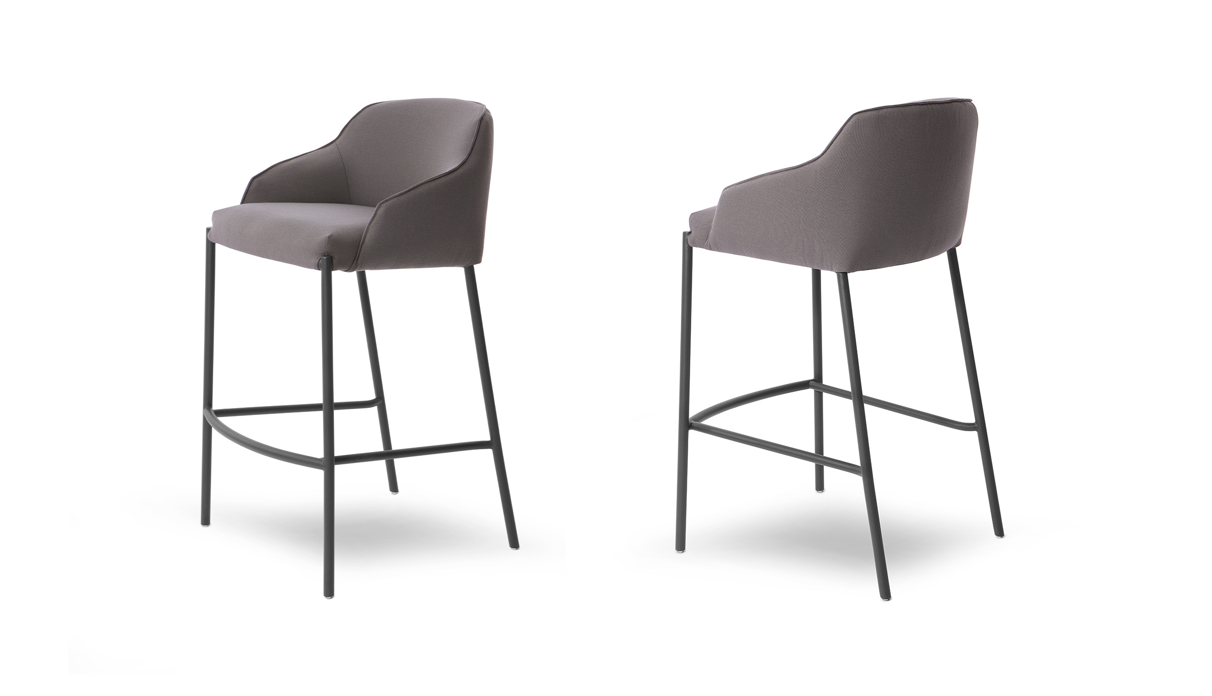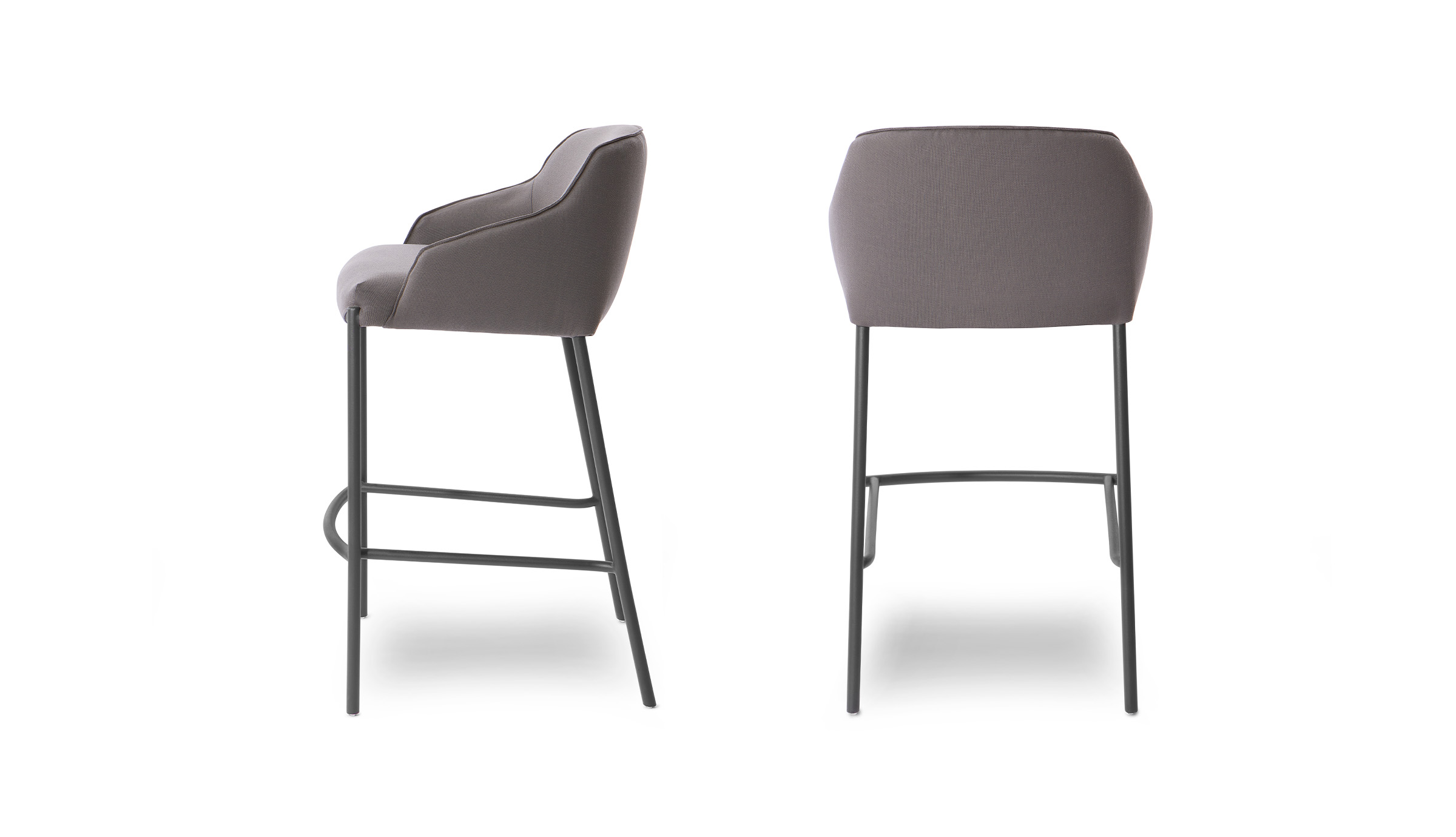 Estrutura em aço inox com pintura eletrostática. Estofado construído com percinta e espumas de densidades variadas e enchimento com plumas sintéticas, envolto por manta acrílica com tecido outliner. Detalhe com costura nervurinha percorrendo o encosto.