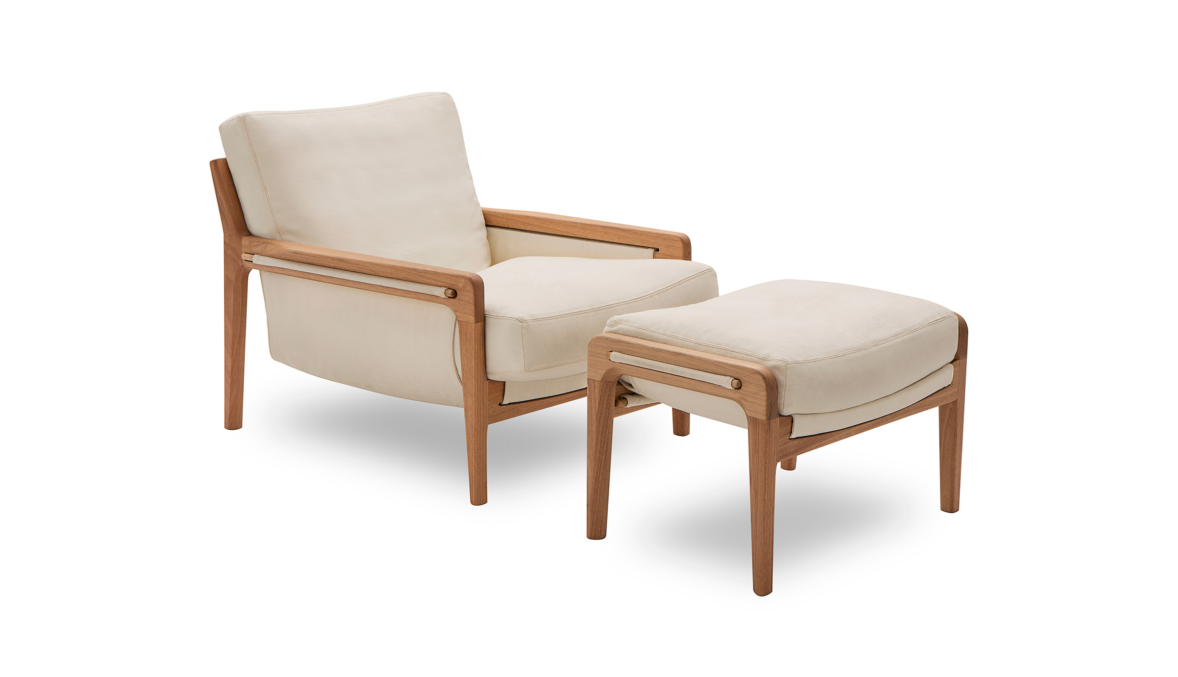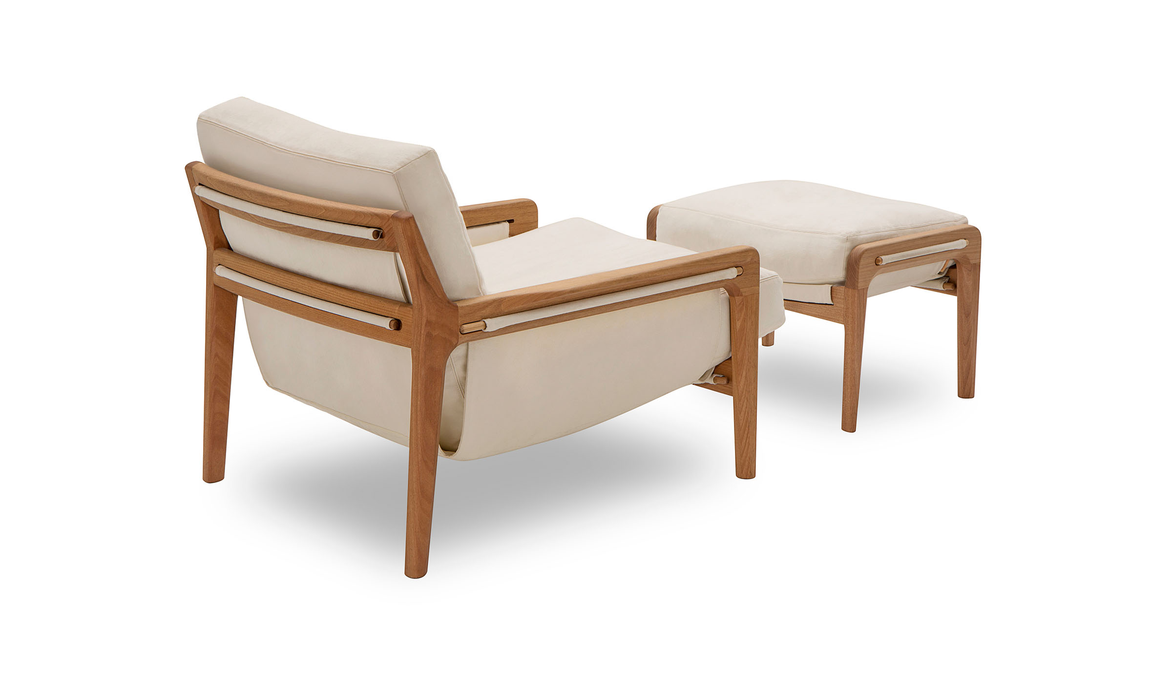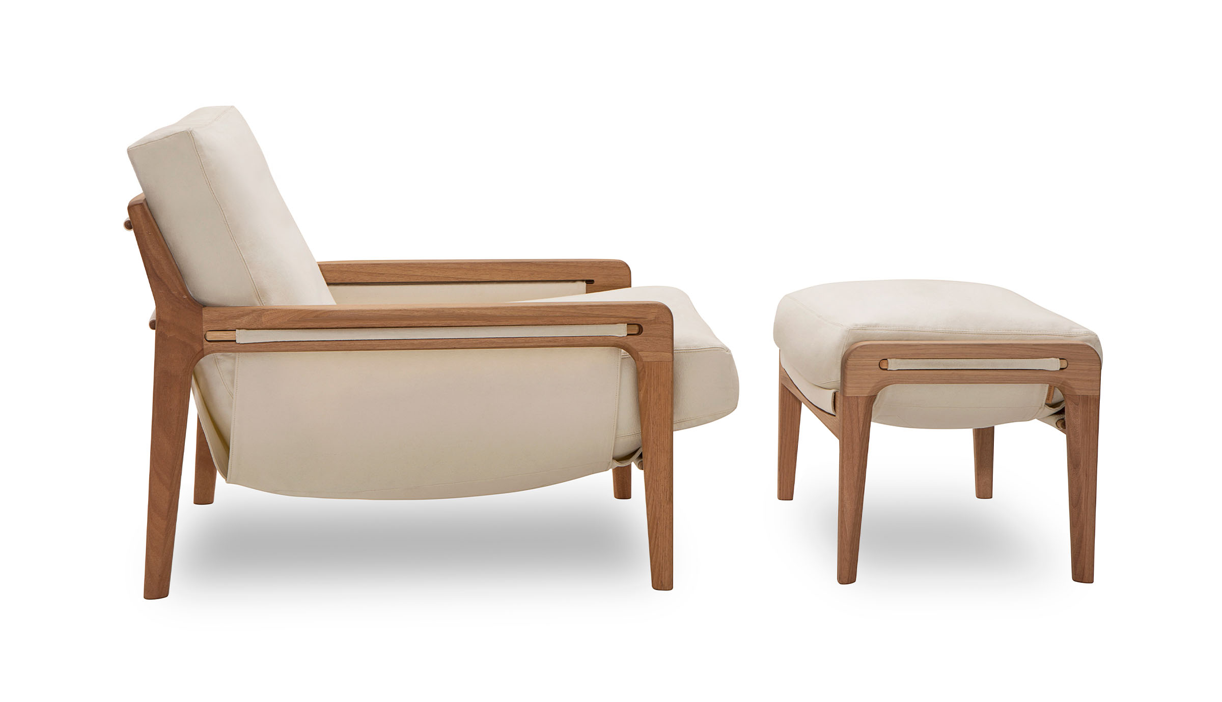 Suas almofadas soltas são sustentadas por um sistema de tensionamento com barras de madeira que atravessam o tecido fixando-o à estrutura com elegância e rigor artesanal.