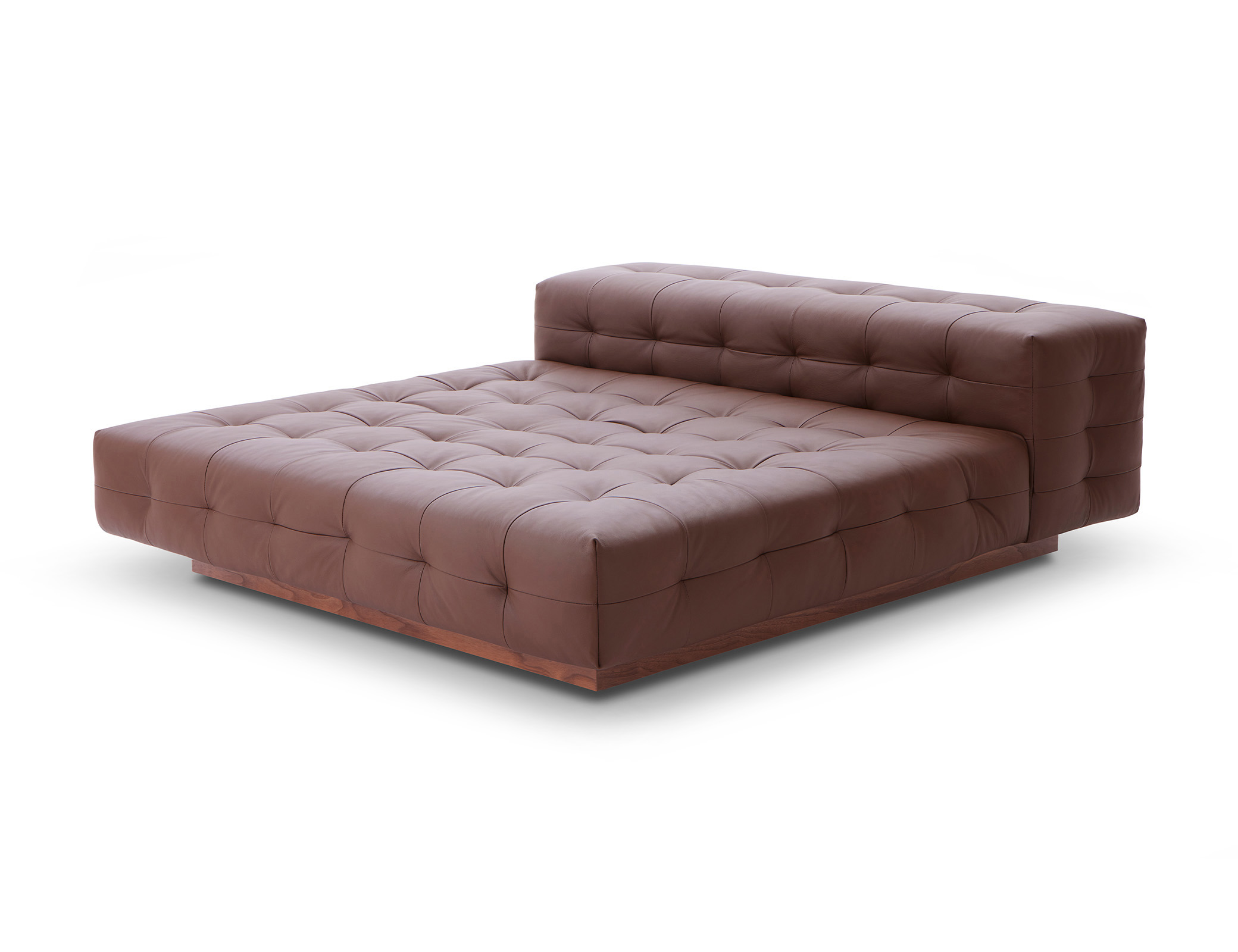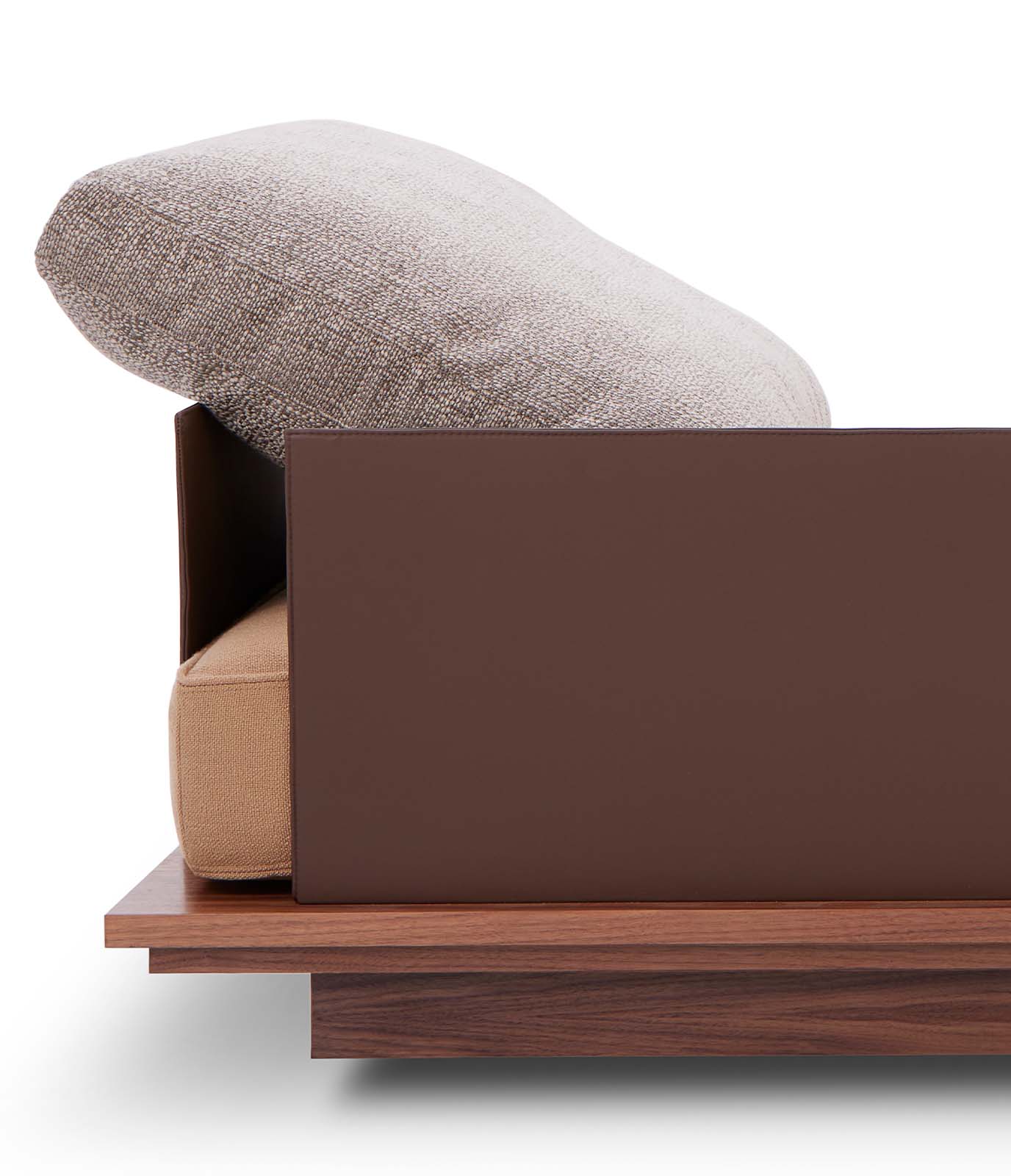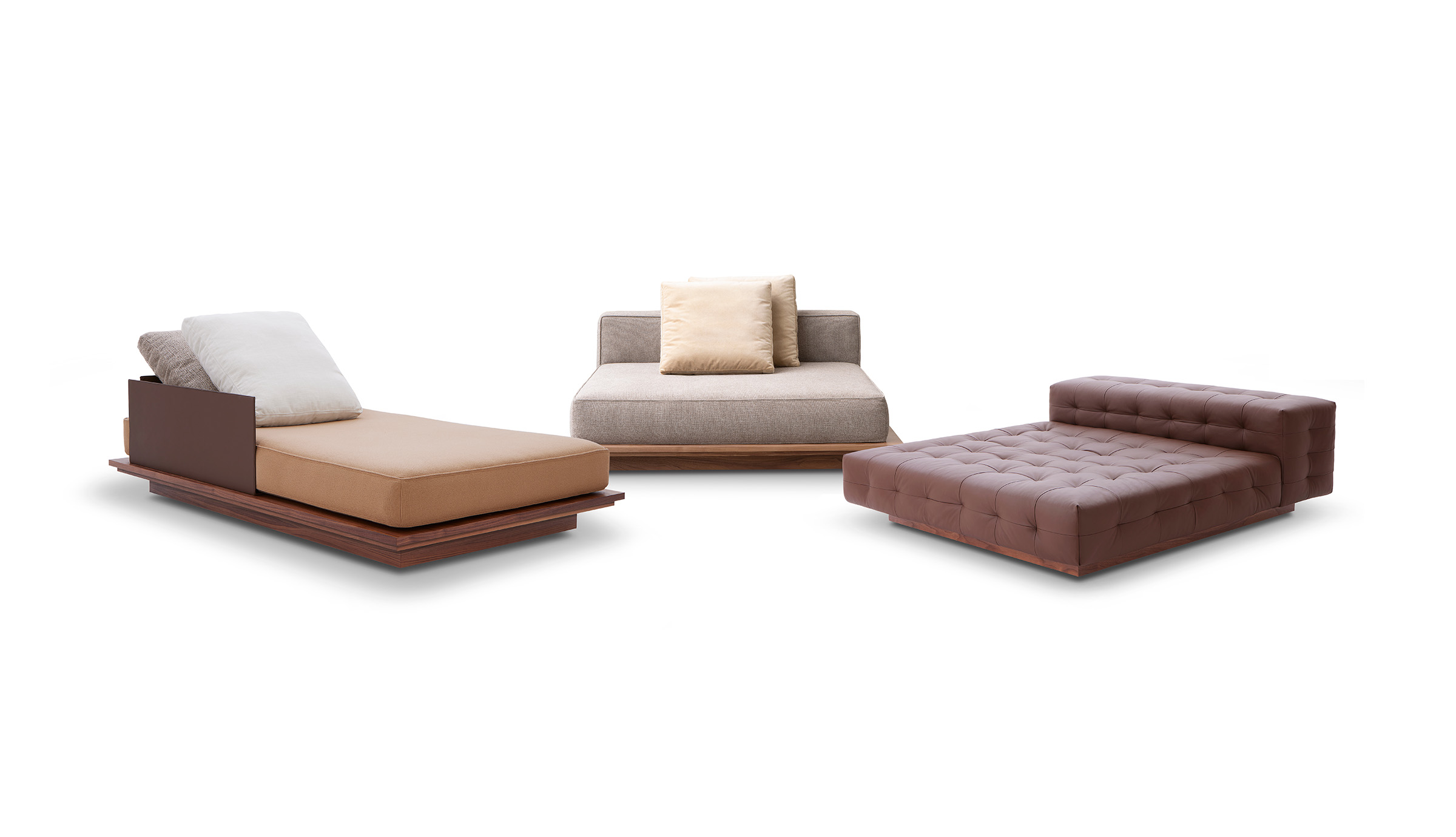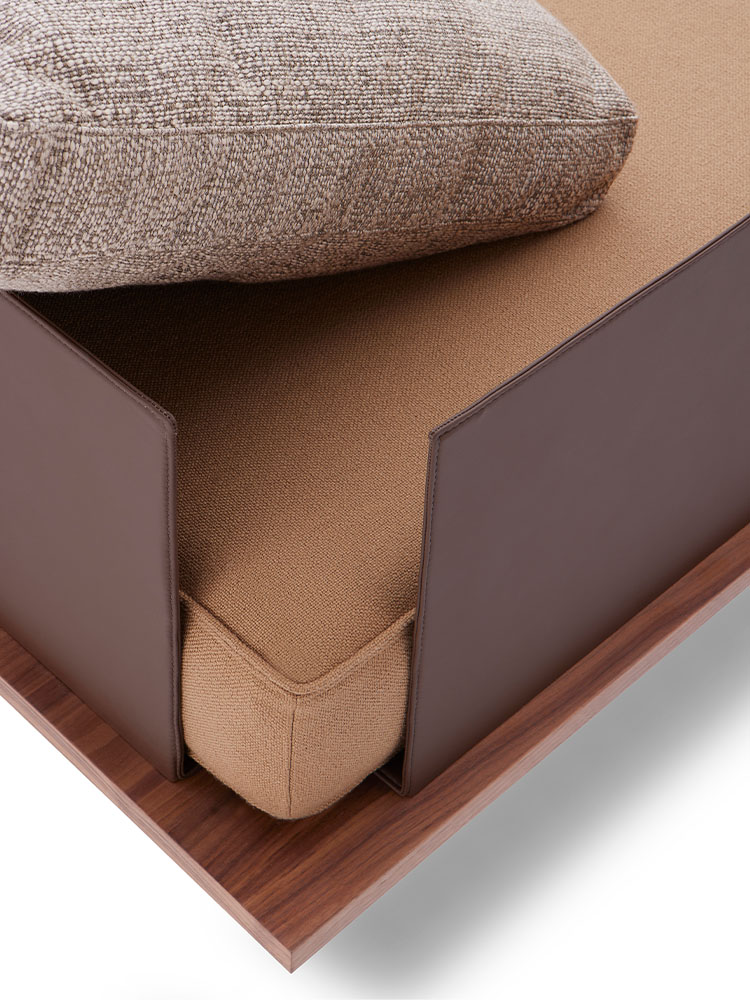 A mais informal das três versões, com encosto mais baixo, sem chapa ou madeira aparente, revela-se através do estofado quadriculado com acabamento em matelassê e capitonê. Acompanhada por pufes que ampliam as possibilidades de composição.
