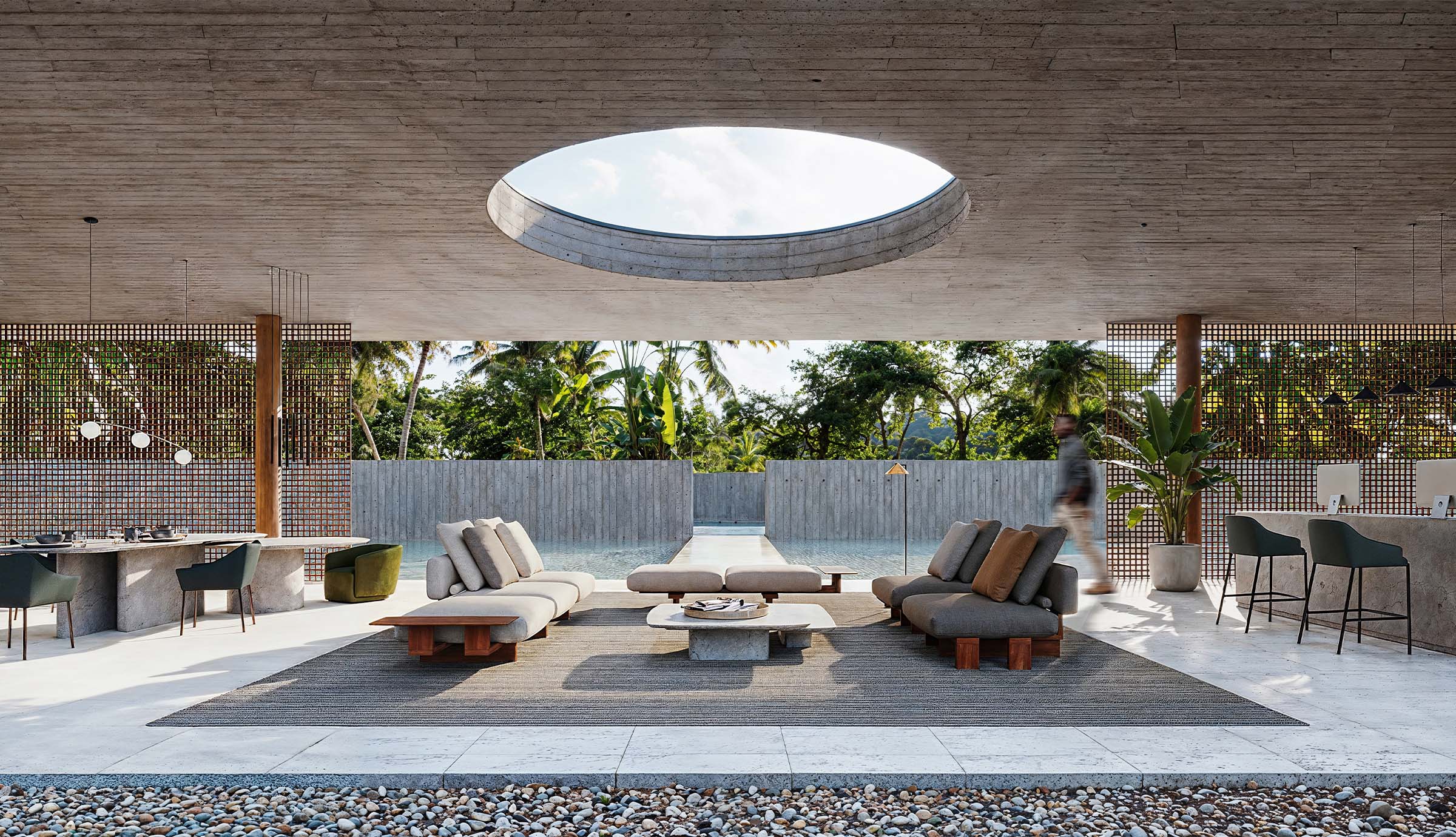 Esta recepção poderia estar em qualquer lugar do mundo, ou em algum que ainda não existe. Entre o concreto aparente, a luz natural e a paisagem ao fundo, o espaço se abre à contemplação e ao encontro entre o interior e exterior.