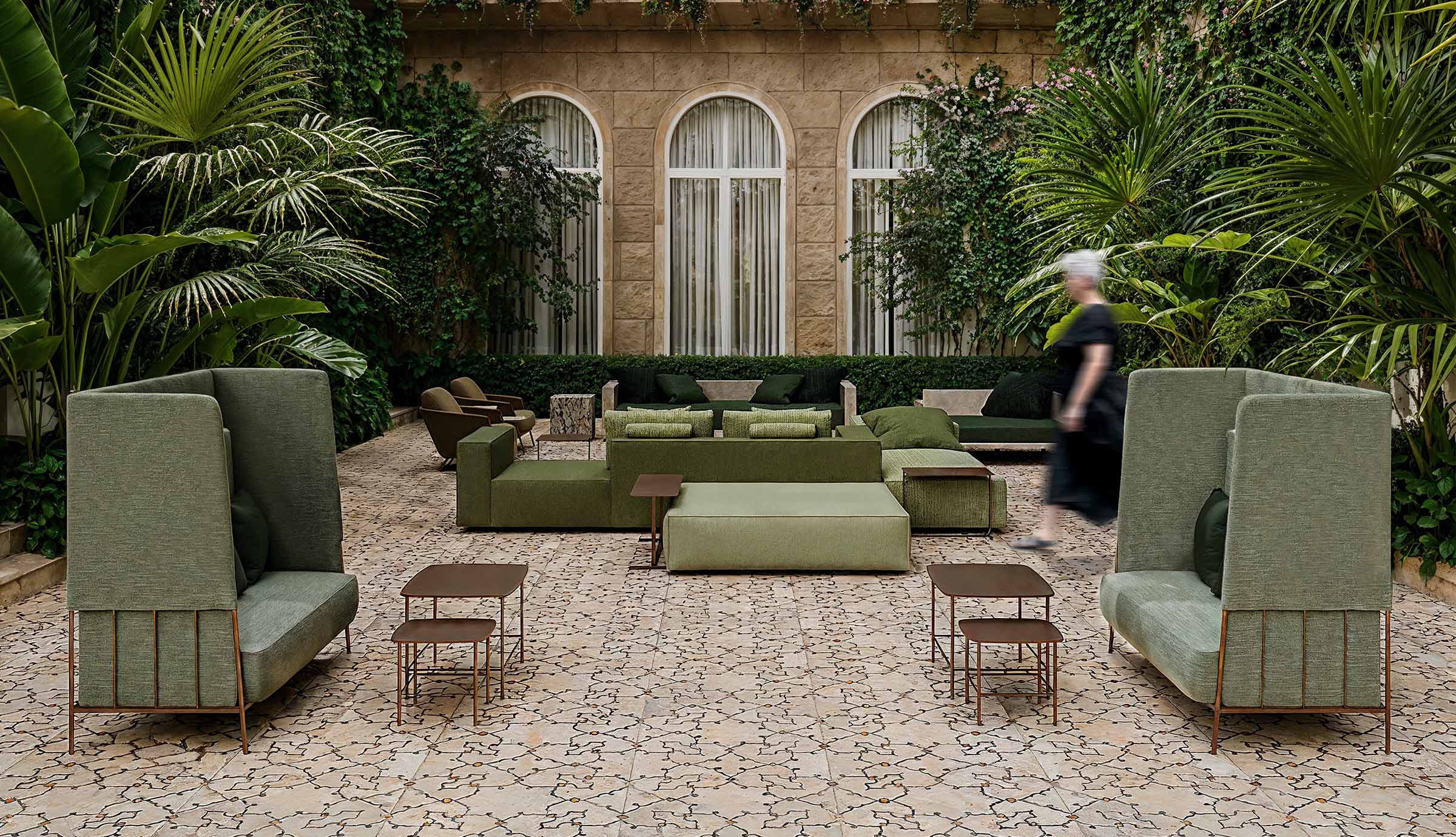 O olhar se perde entre os volumes e texturas deste átrio, enquanto a luz natural atravessa a estrutura envidraçada, revelando o encontro entre o clássico e contemporâneo. O verde cresce como se sempre estivesse ali, suavizando as linhas e transformando a grandiosidade em acolhimento. Um espaço de permanência para receber, conversar e imaginar novas histórias.