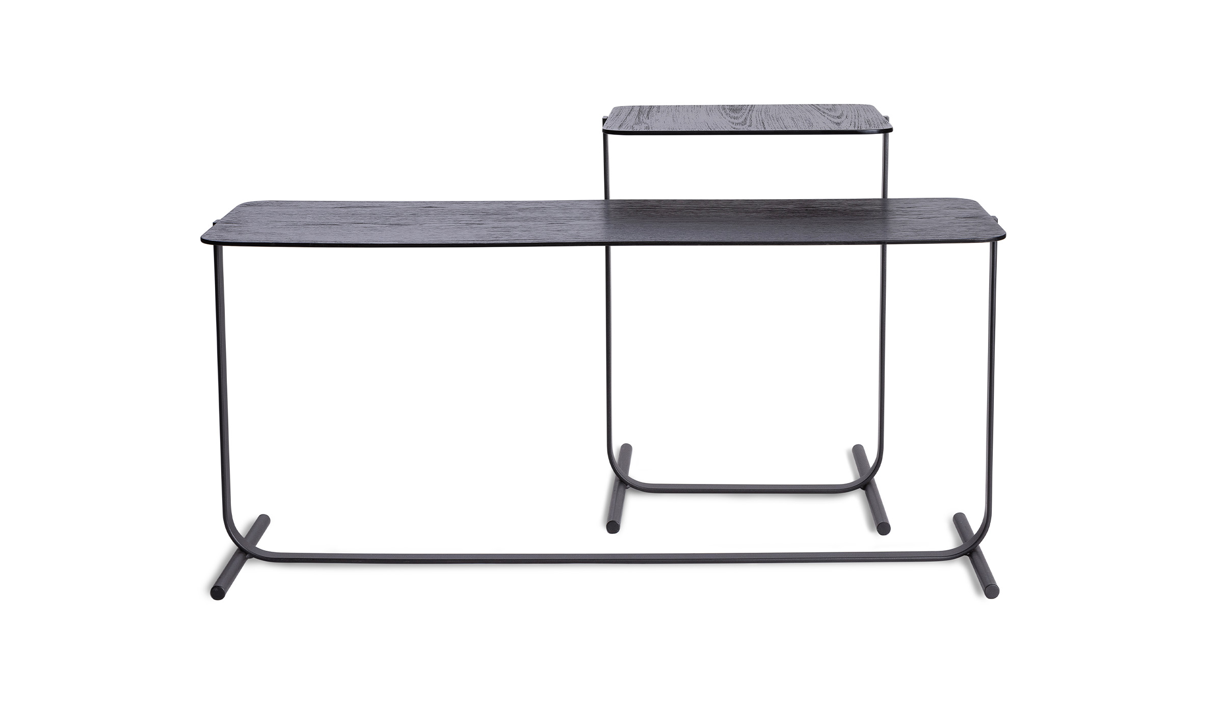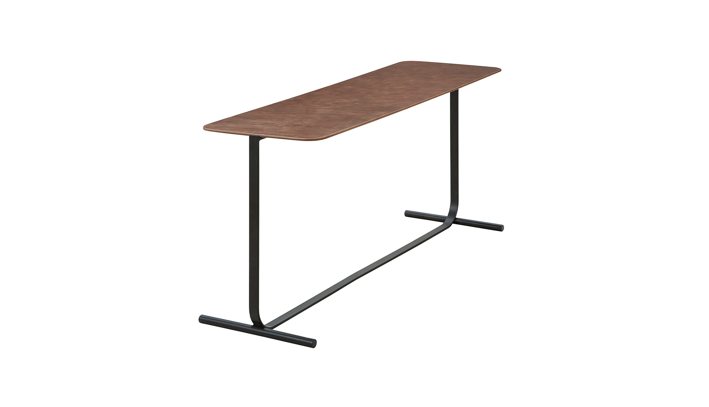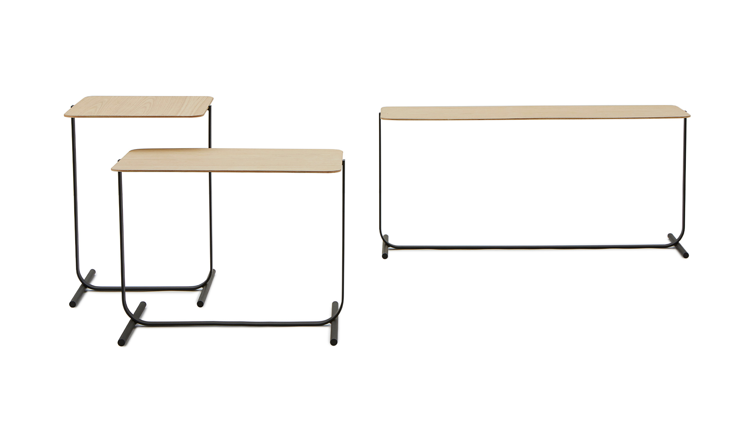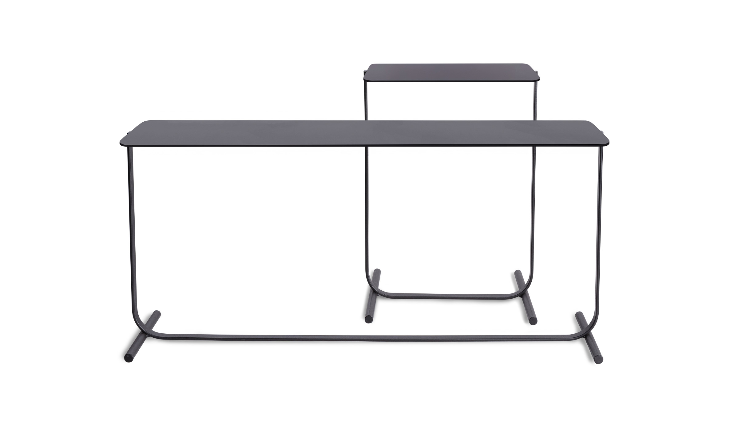 Através da união sutil entre os pés tubulares em aço e a barra curva que os tangencia, cria-se um suporte contínuo e leve para o tampo.