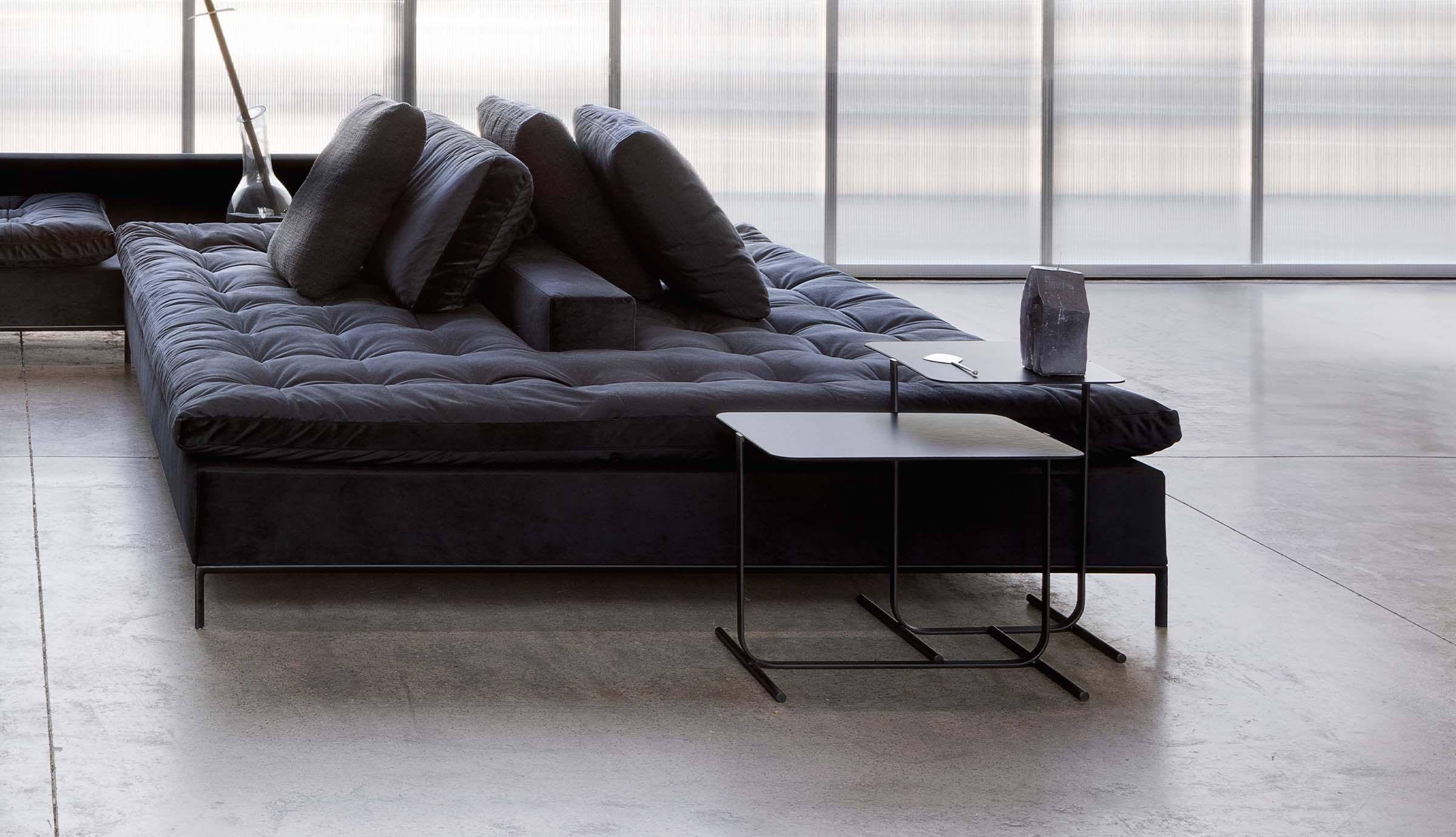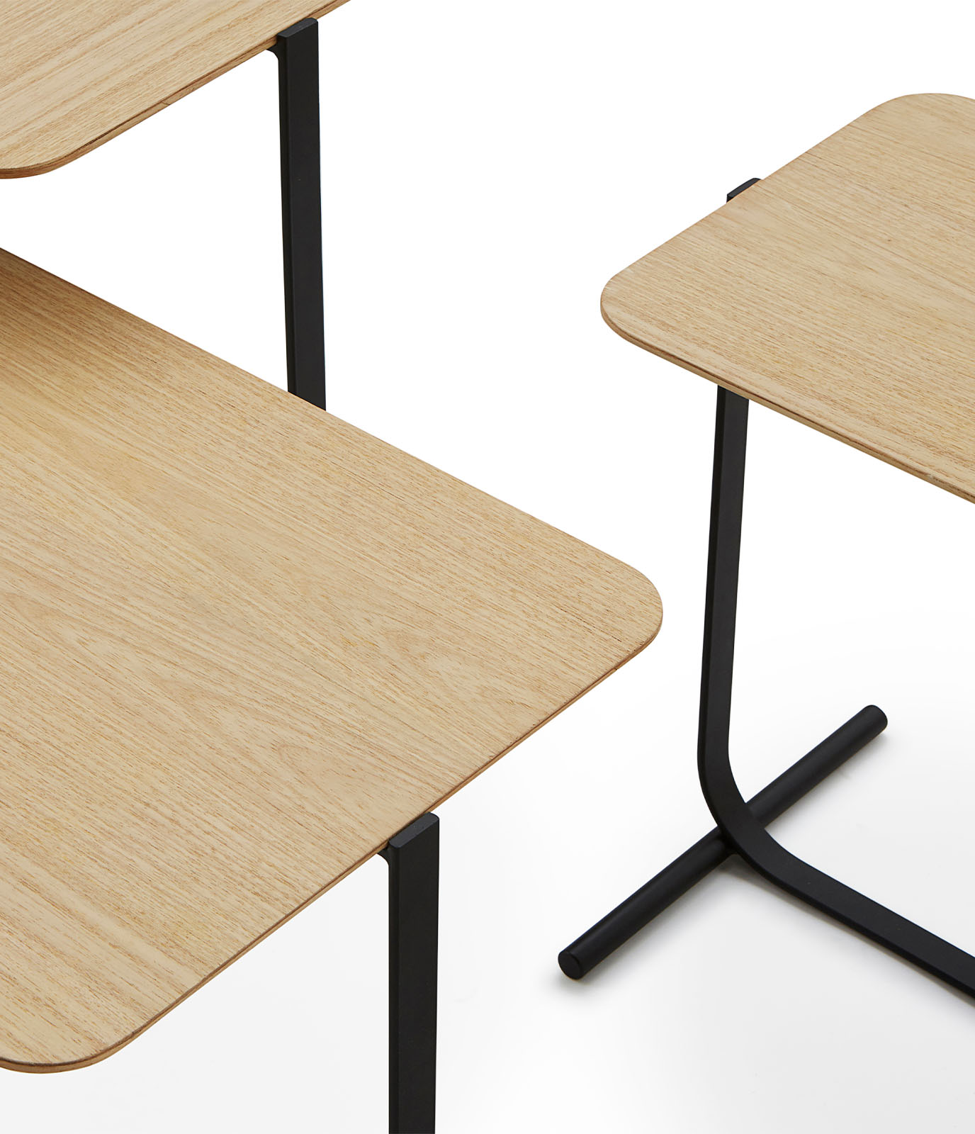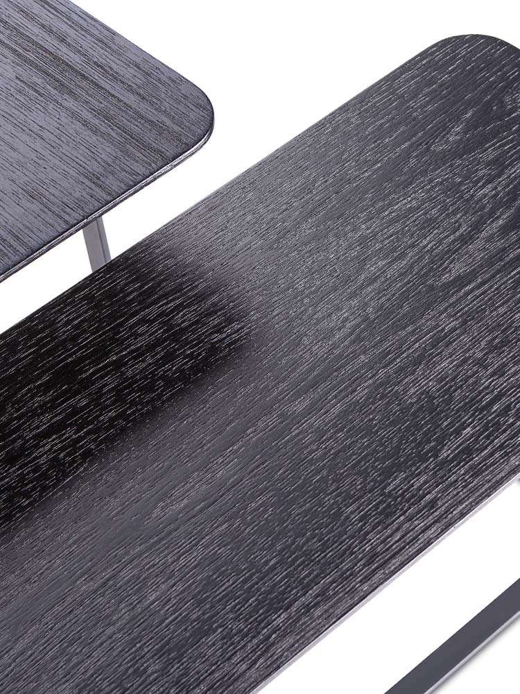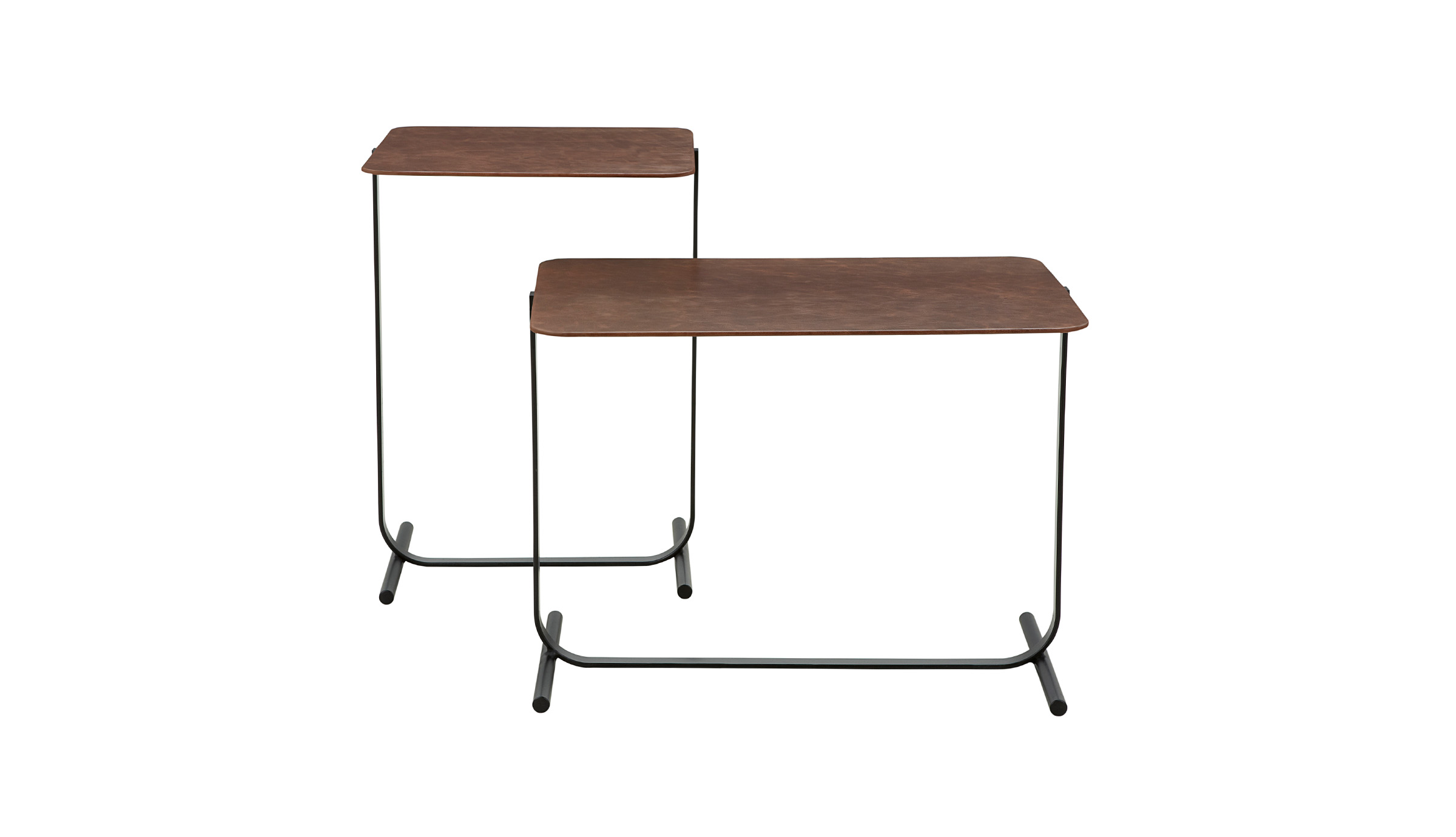 Através da união sutil entre os pés tubulares em aço e a barra curva que os tangencia, cria-se um suporte contínuo e leve para o tampo.