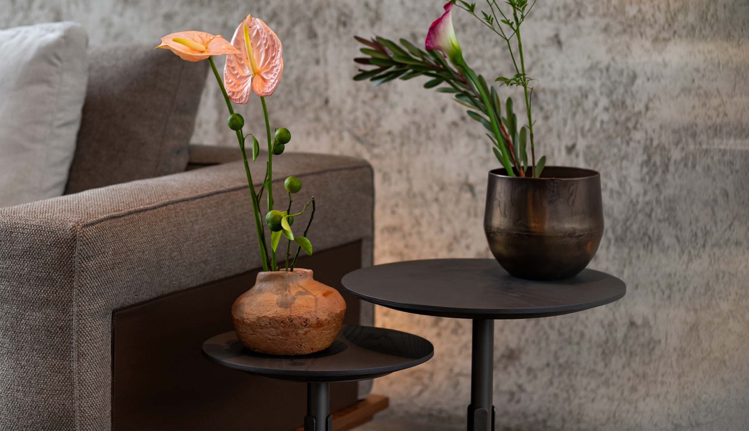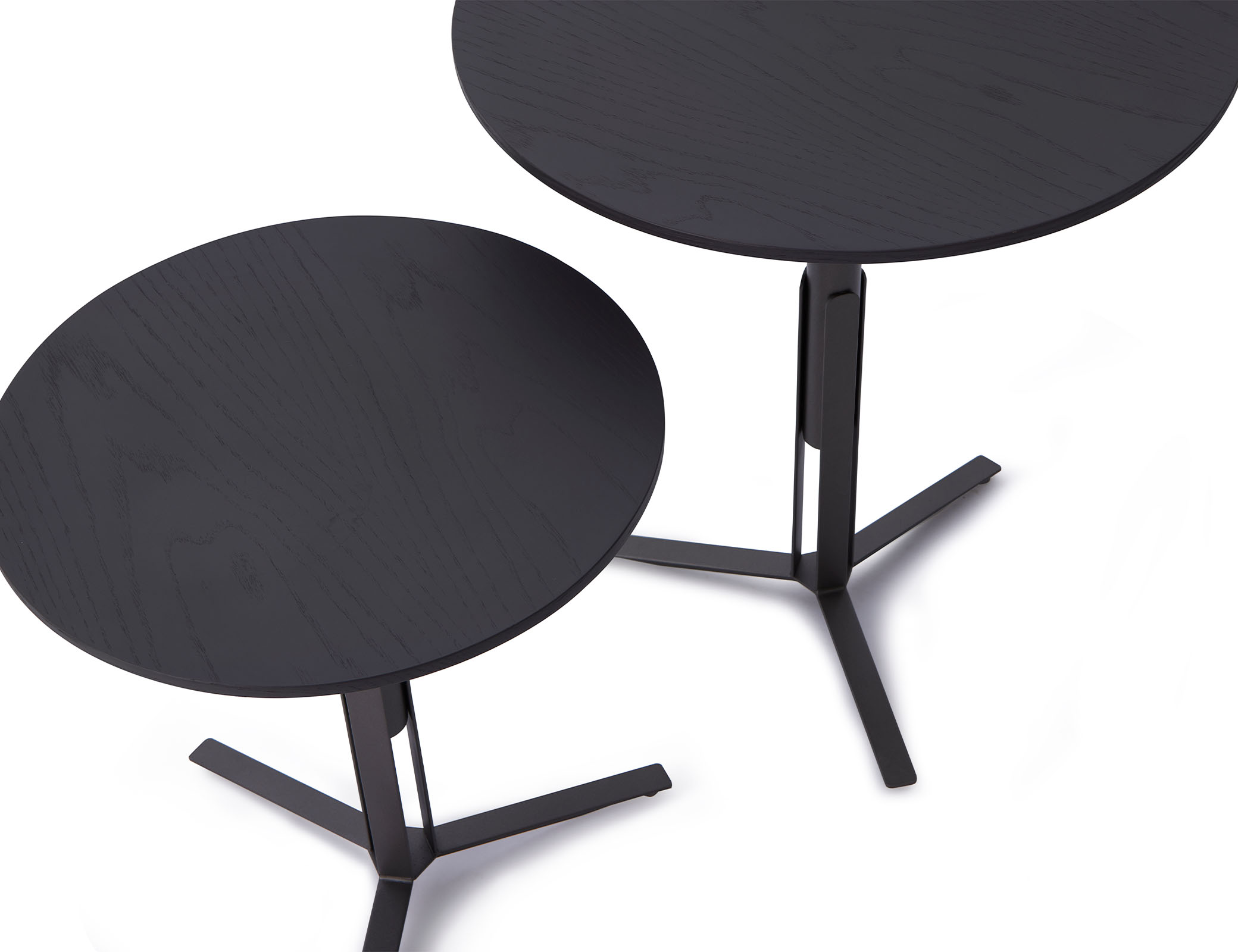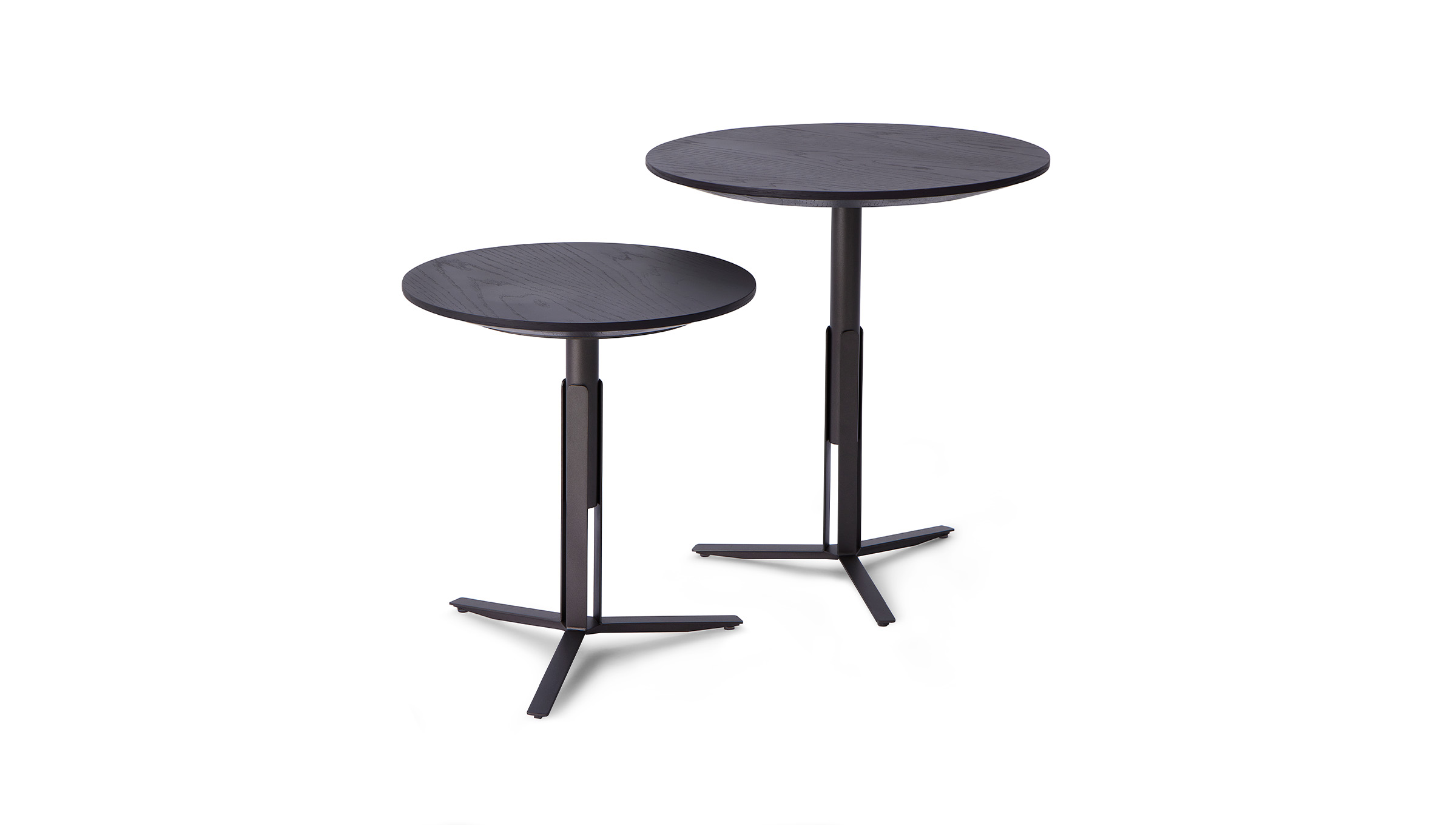 Uma série de mesas de apoio que equilibram diferentes linguagens entre o plano e o circular.