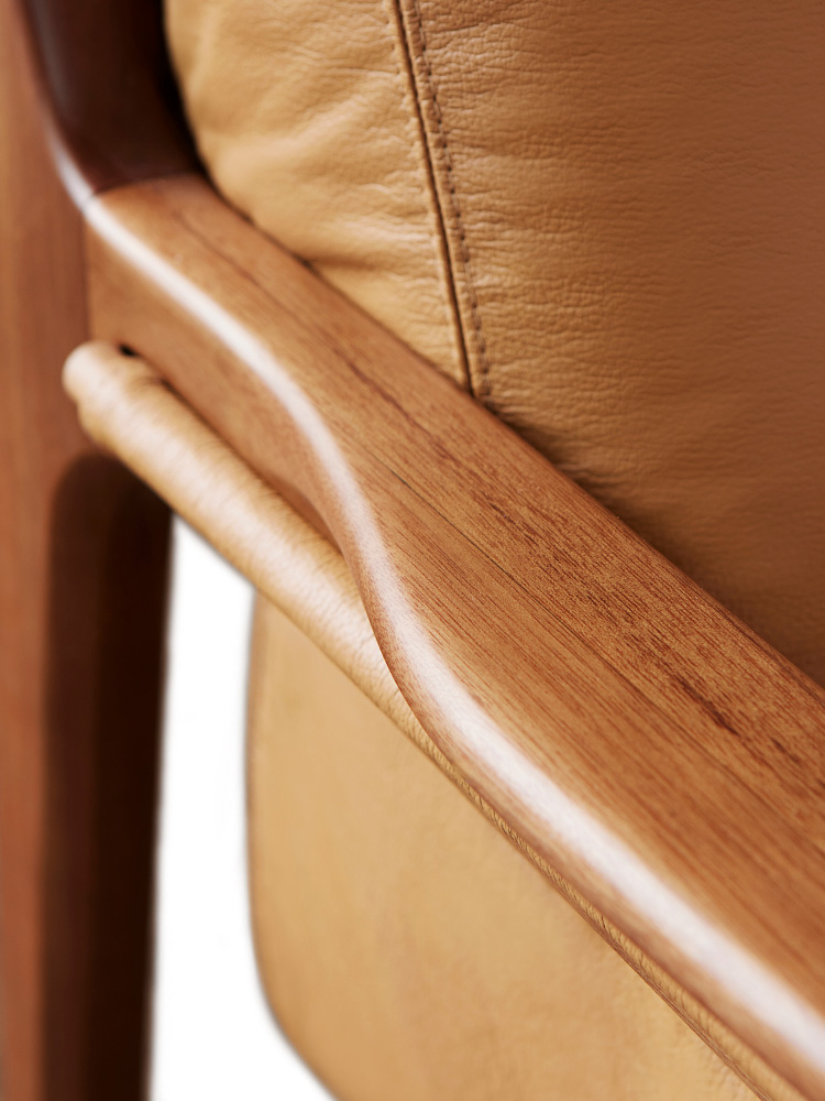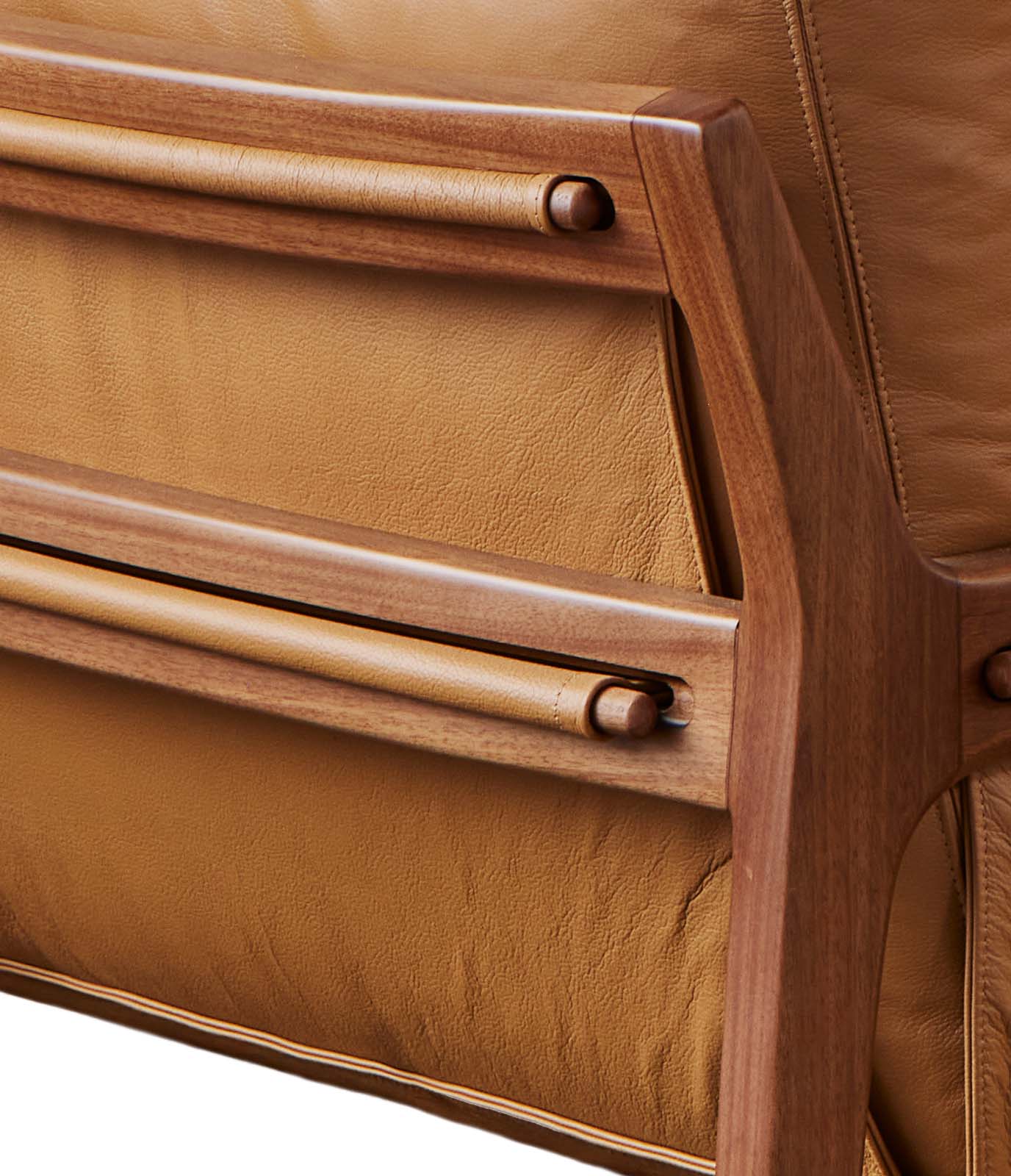 Suas almofadas soltas são sustentadas por um sistema de tensionamento com barras de madeira que atravessam o tecido fixando-o à estrutura com elegância e rigor artesanal.