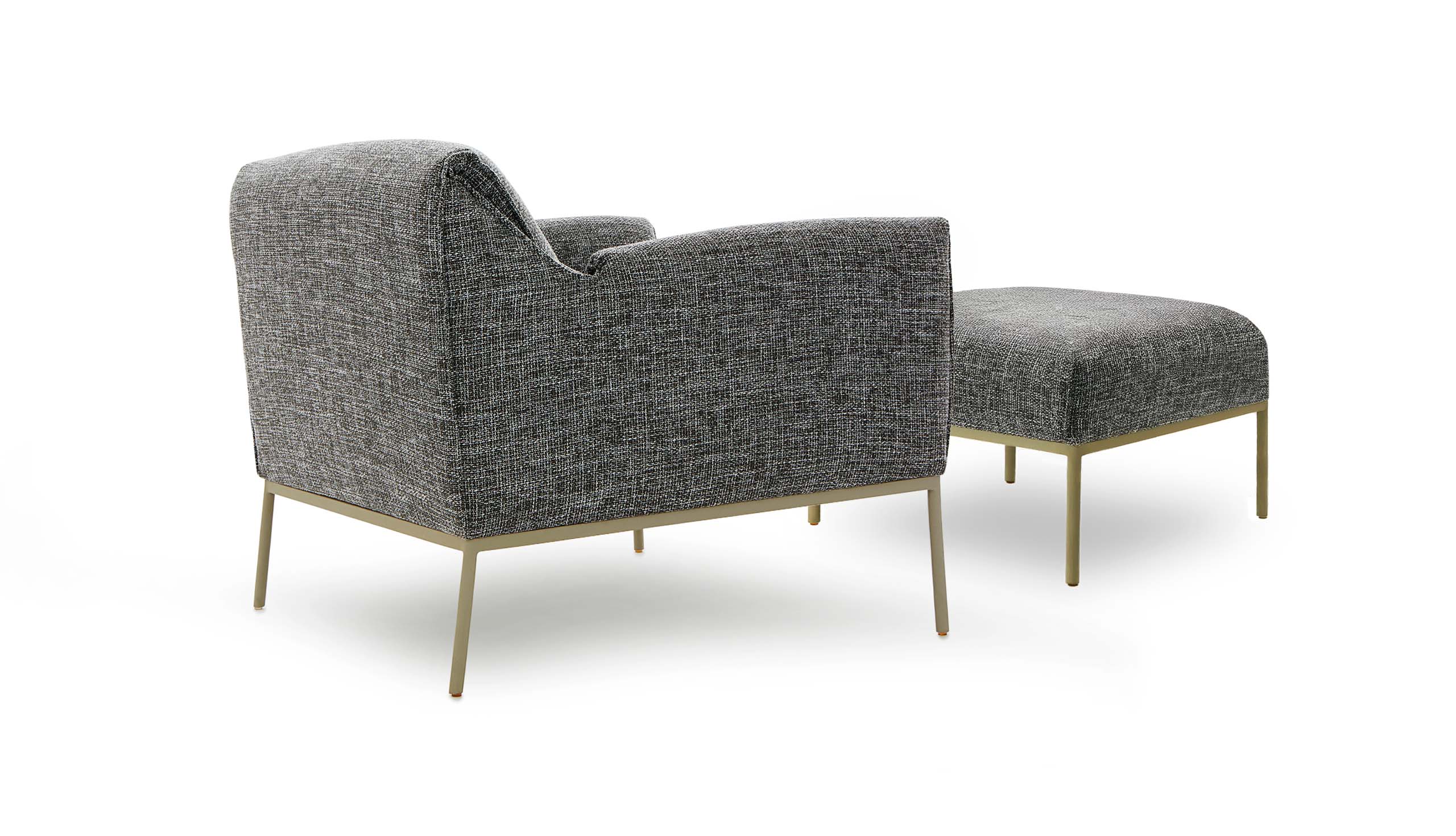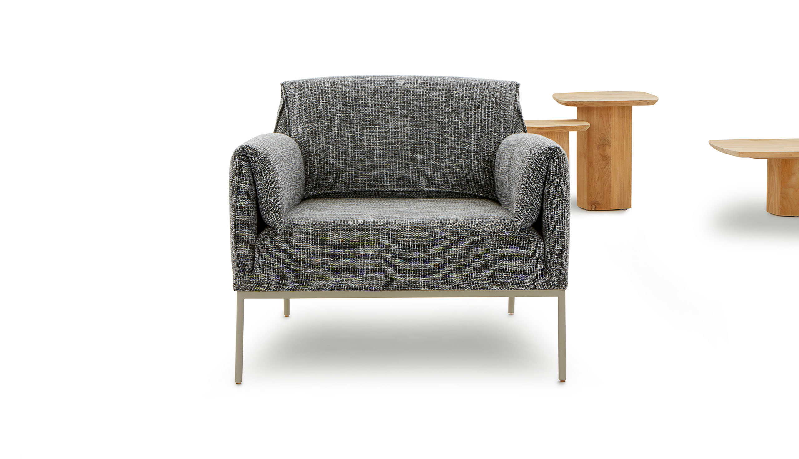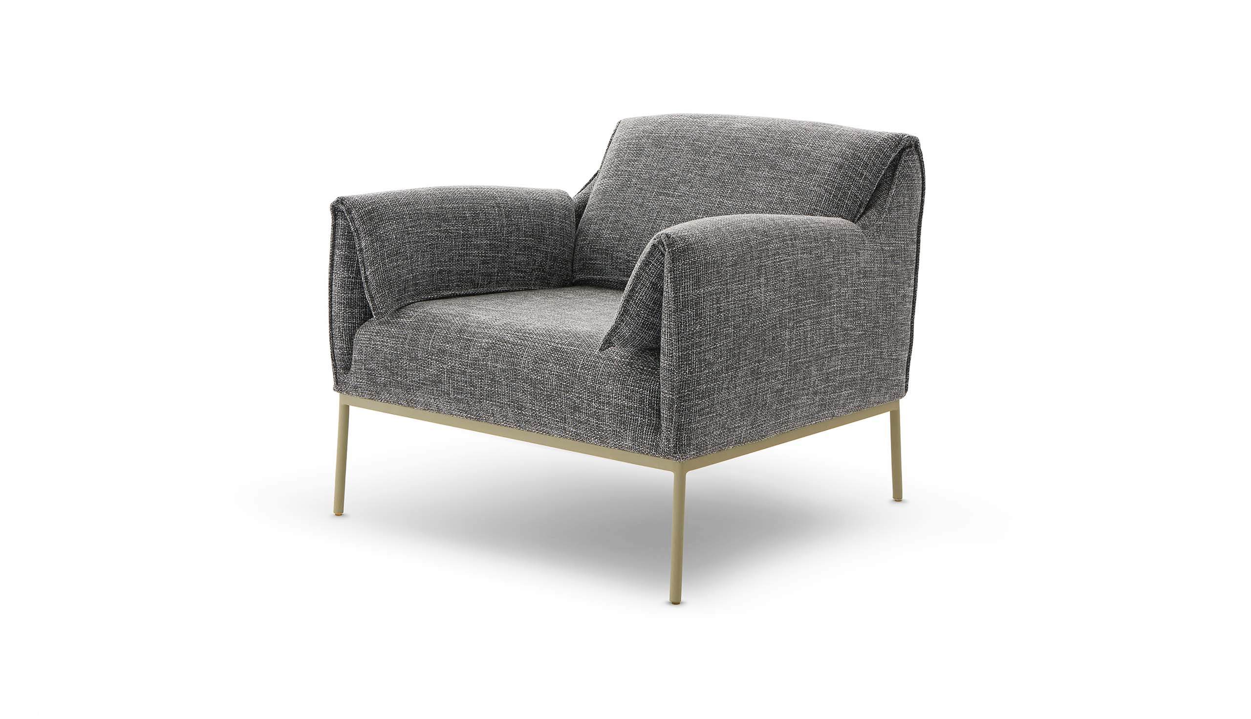 Buscando equilíbrio físico e formal, a poltrona combina sua robusta parte estofada a pés de perfis finos e delicados que a elevam do solo, criando um vão livre abaixo dela.