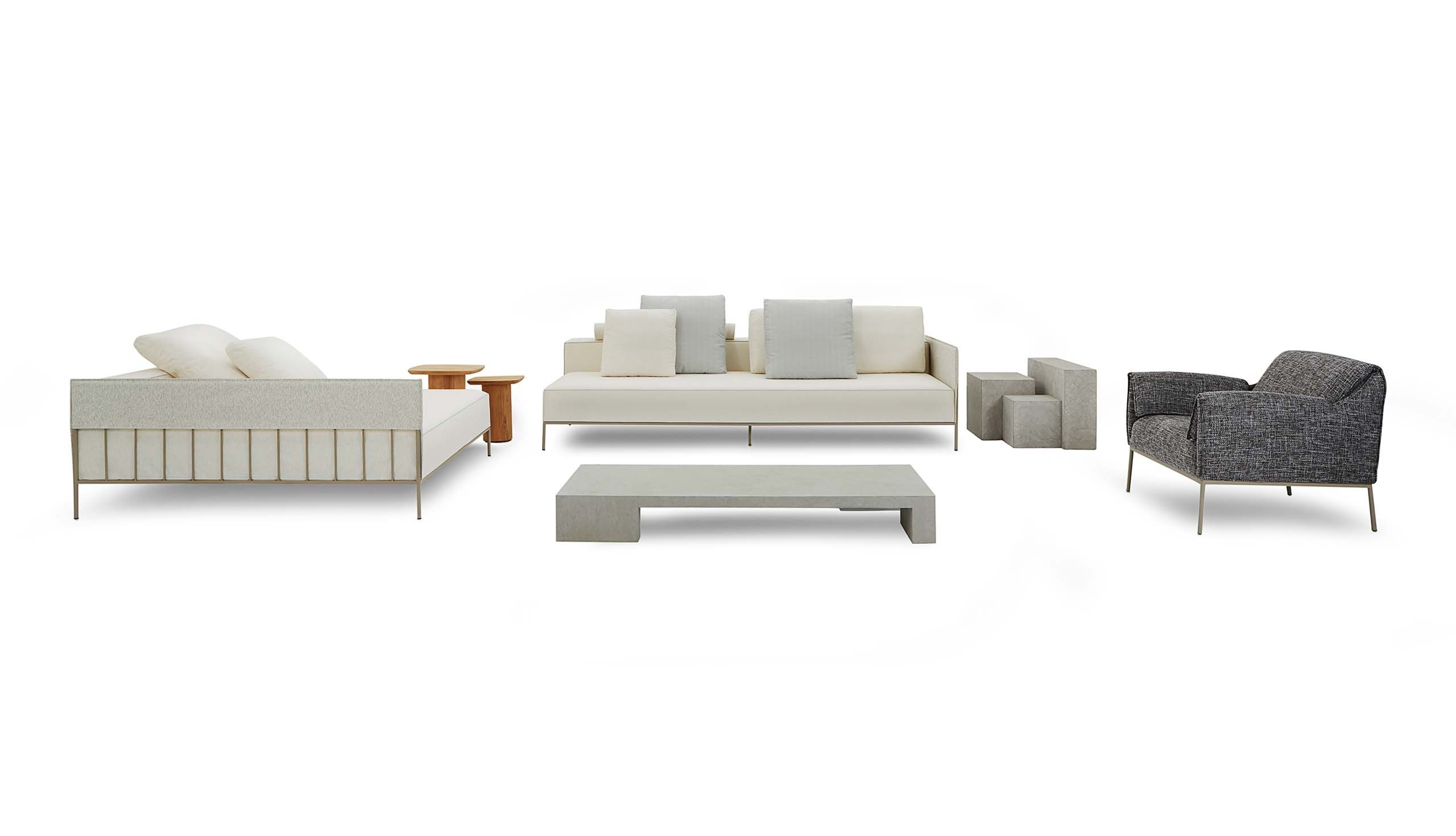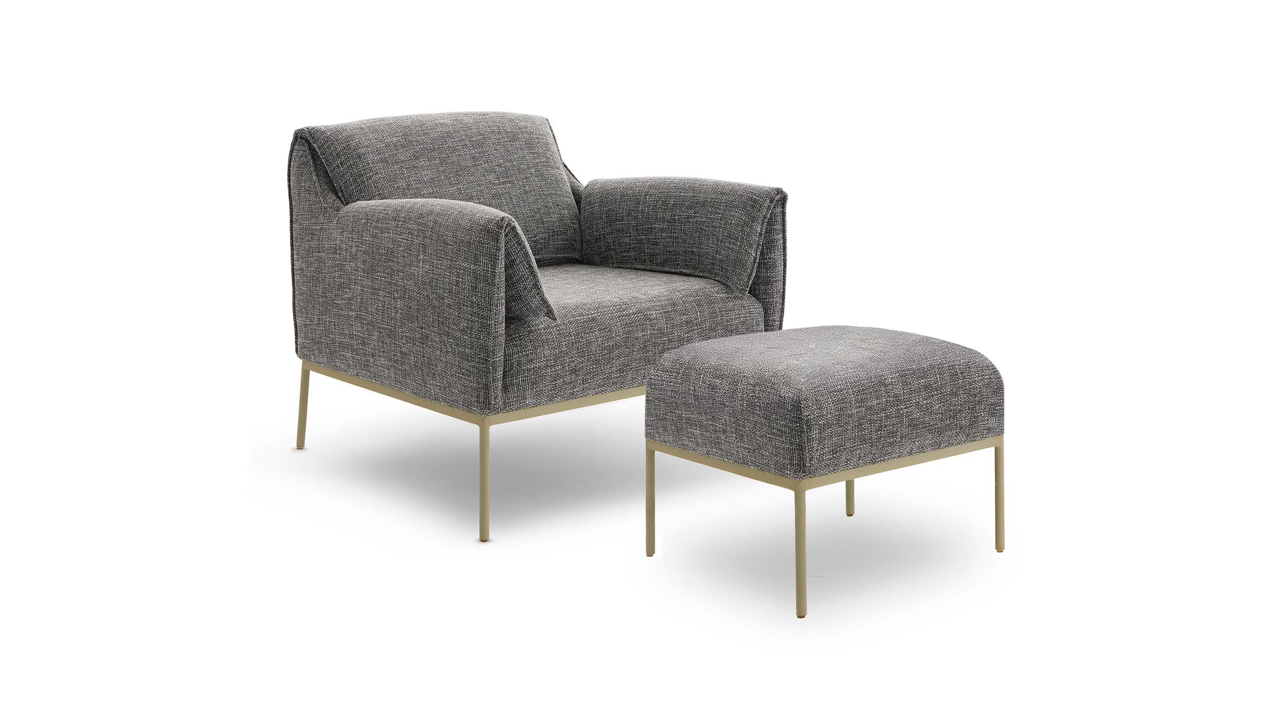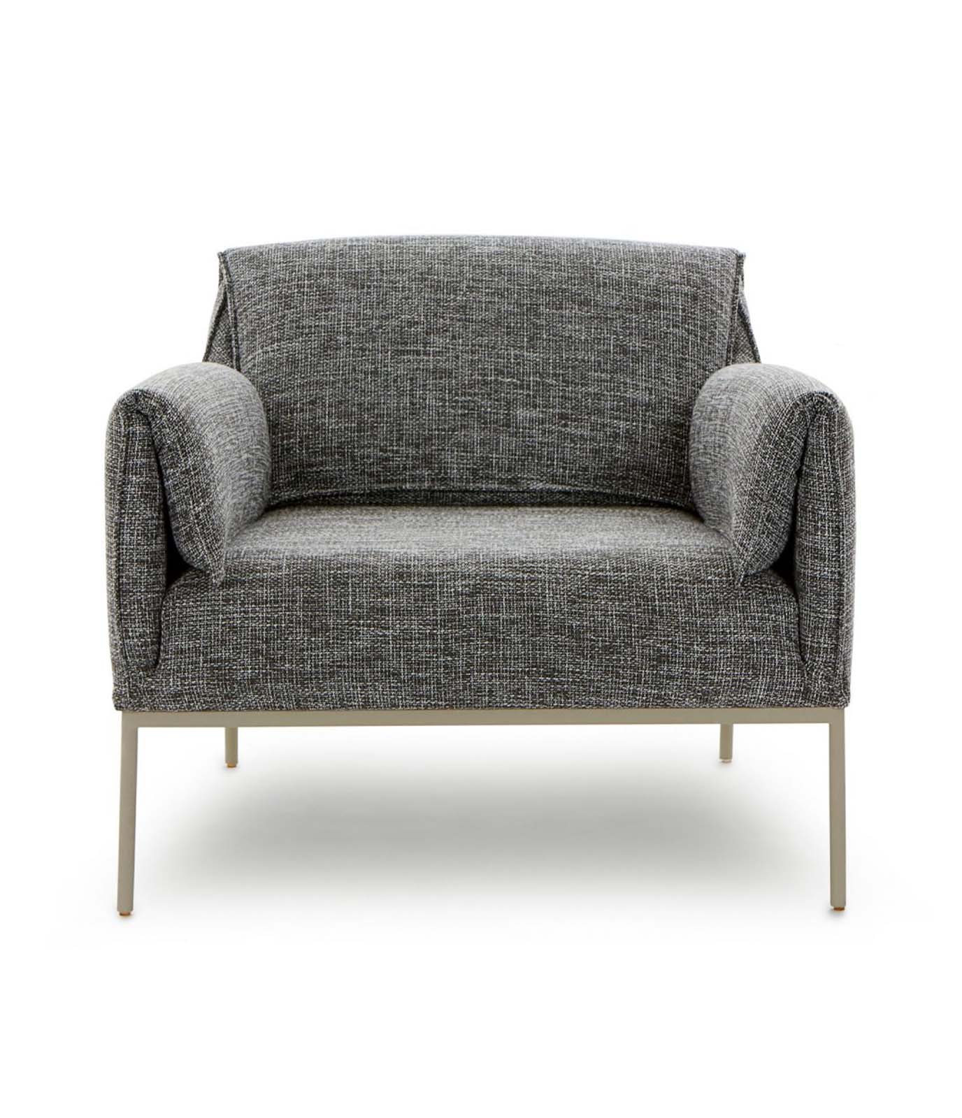 Buscando equilíbrio físico e formal, a poltrona combina sua robusta parte estofada a pés de perfis finos e delicados que a elevam do solo, criando um vão livre abaixo dela.