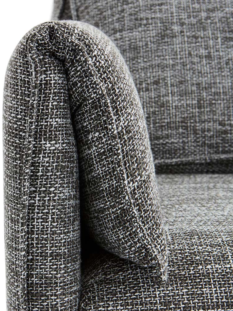 Além de proporcionar maior conforto e contraste entre a parte externa, mais rígida, e o interior despojado, os braços e o encosto incitam a curiosidade e estimulam a interação entre o indivíduo e o objeto.