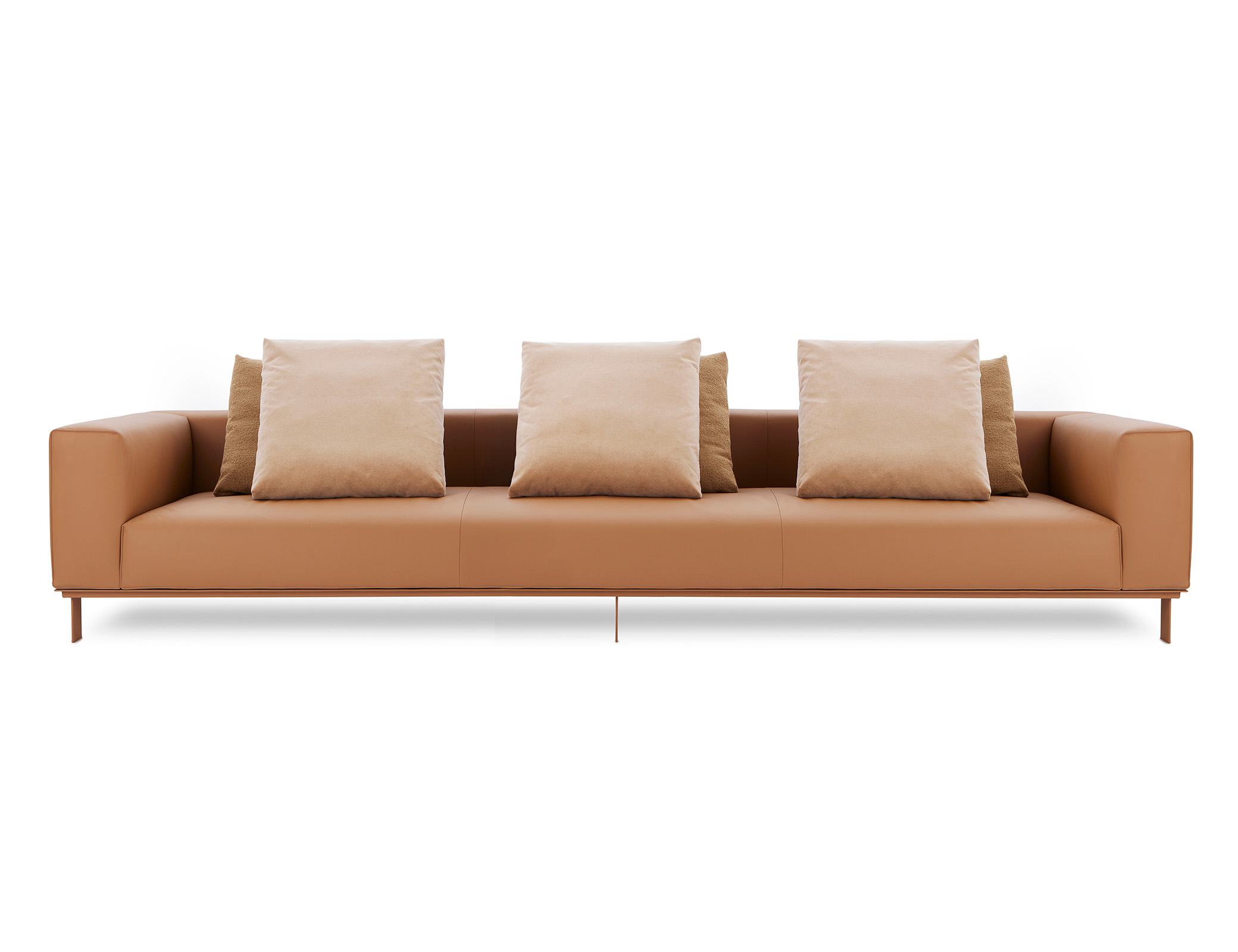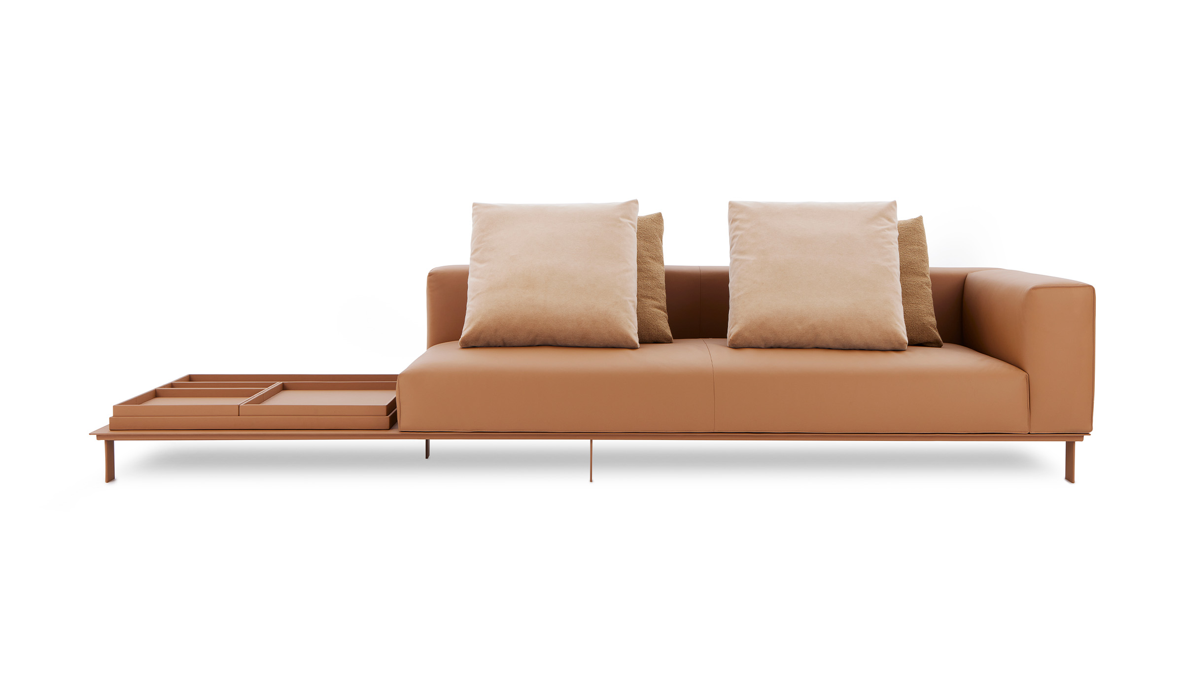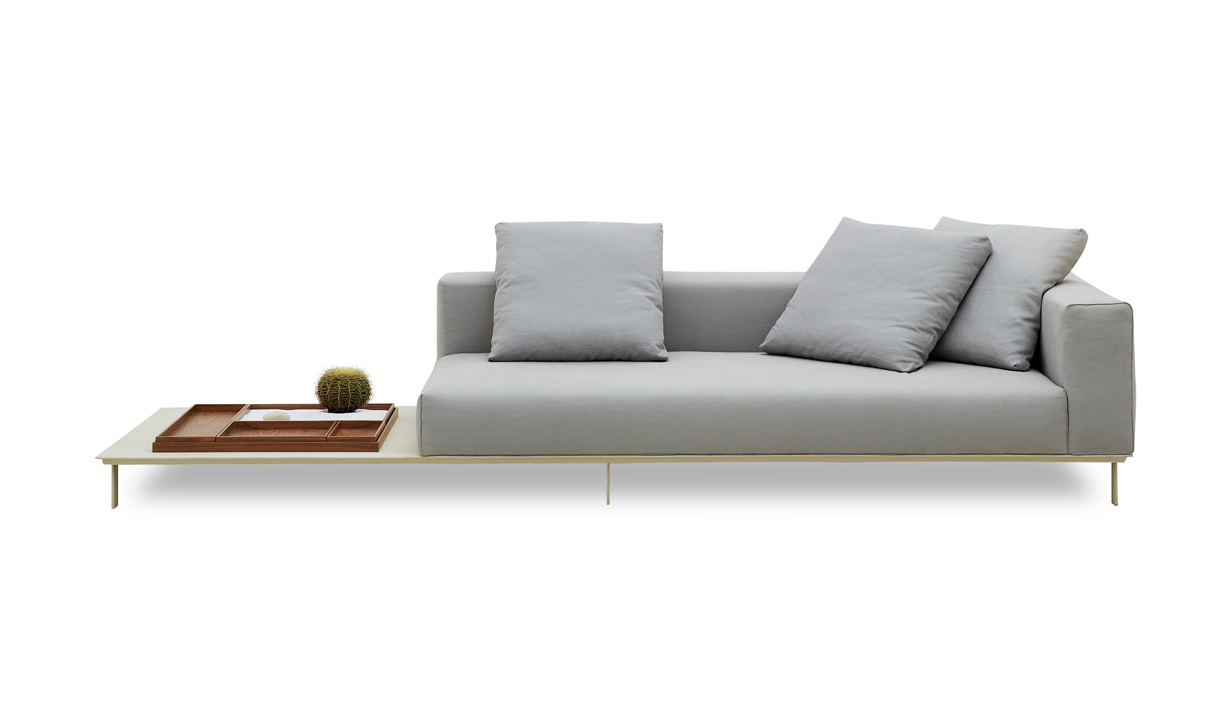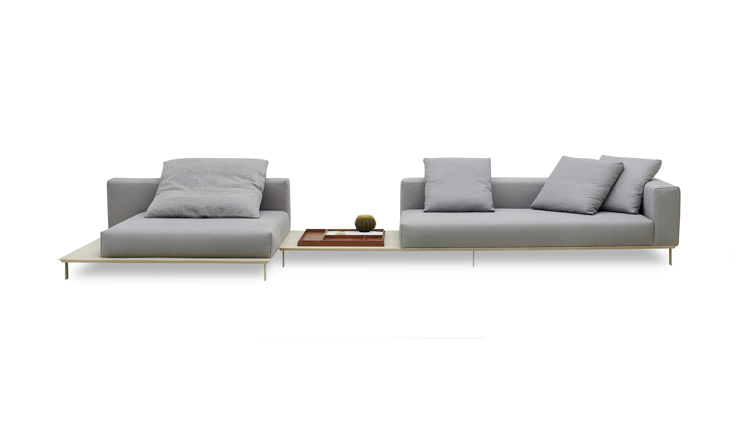 Sua estrutura em chapa de aço, com linhas quase invisíveis, cria um efeito de suspensão sutil e destaca o conforto do estofado com leveza,
